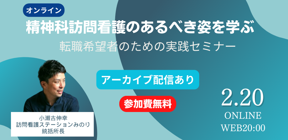 *本セミナー・イベントは、参加対象を精神科訪問看護への転職を検討している方や転職活動している方に限定しております。同業他社の方のご参加はご遠慮いただいておりますので、何卒ご理解のほどお願い申し上げます。