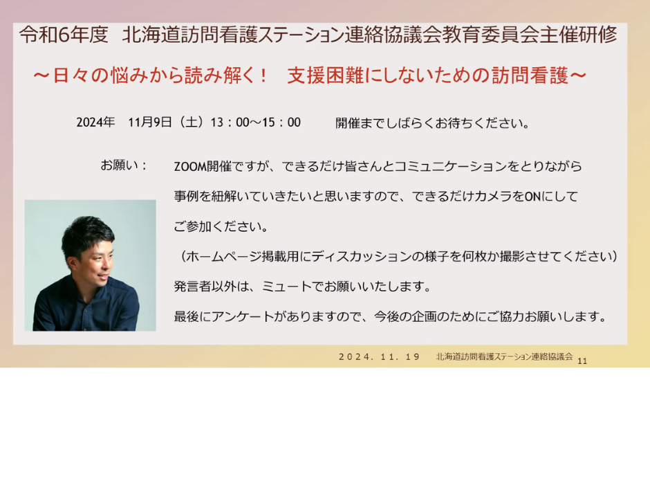 2024年11月9日、弊社の小瀬古が「日々の悩みから読み解く! 支援困難にしないための訪問看護」というテーマで、北海道訪問看護ステーション連絡協議会にて事例検討を行いました。