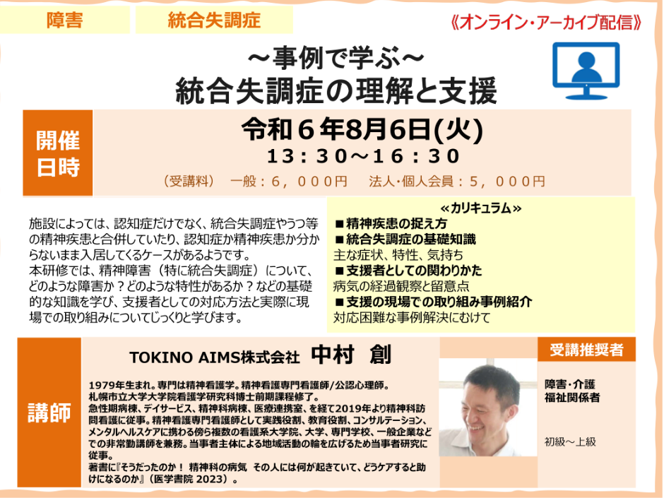 かながわ福祉サービス振興会にて登壇 2024/08/06 2024/08/06にAIMS所属の精神看護専門看護師、中村が登壇しました。 テーマは「事例で学ぶ統合失調症」です。 福祉領域においても、精神疾患に関する知識を向上させていきたいという支援者が多く、嬉しく思っています。 疾患の基礎知識だけではなく、具体的な関わり方までお伝えさせていただきました、 中村の方は「そうだったのか!精神科の病気」という本の著者でもあることから、講義も好評を得ています。 講義のご要望がありましたら、お問い合わせからご連絡ください。