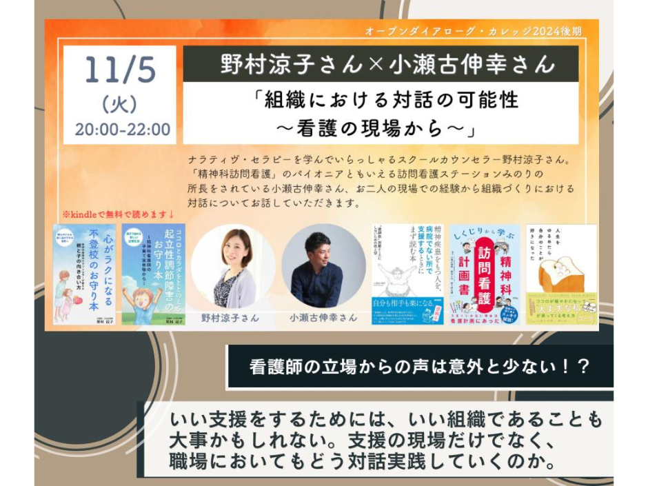 2024年11月5日に弊社の小瀬古が野村涼子さんと共にオープン・ダイアローグカレッジ2024後期に登壇しました。