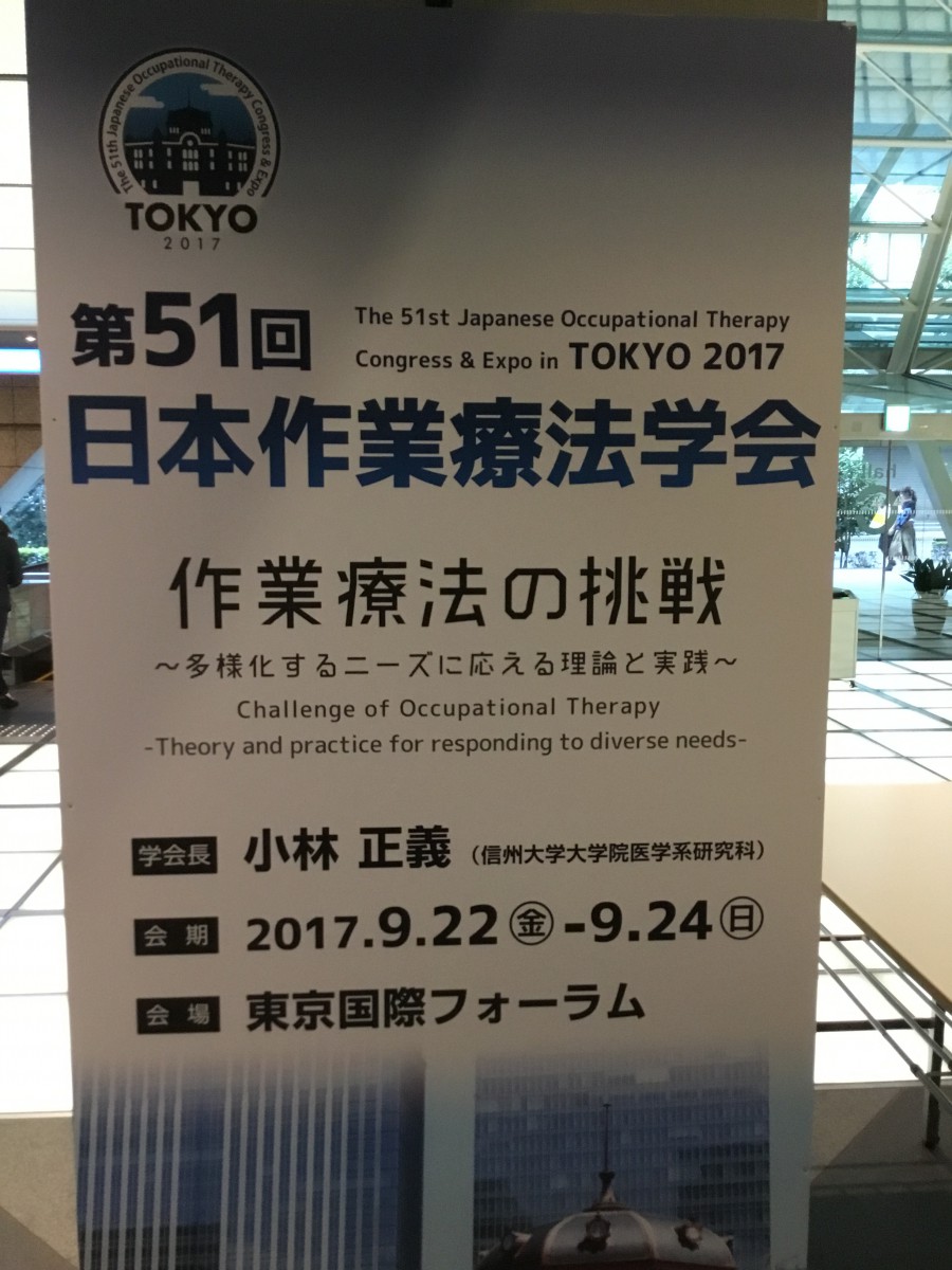 第51回 日本作業療法学会に参加しました 2017/09/25 東京国際フォーラムで開催されました第51回日本作業療法学会に統括管理責任者の進あすか、奈良所長の小瀬古伸幸、作業療法士の清家健男、加藤豊文、星竜平が参加しました。 作業遂行のカナダモデルや何のために理論があるかなど、作業療法士の専門性を活かした地域支援の方向性を学んできました。 今回の学びを支援に活かしていきたいと考えています。今後ともよろしくお願いします。