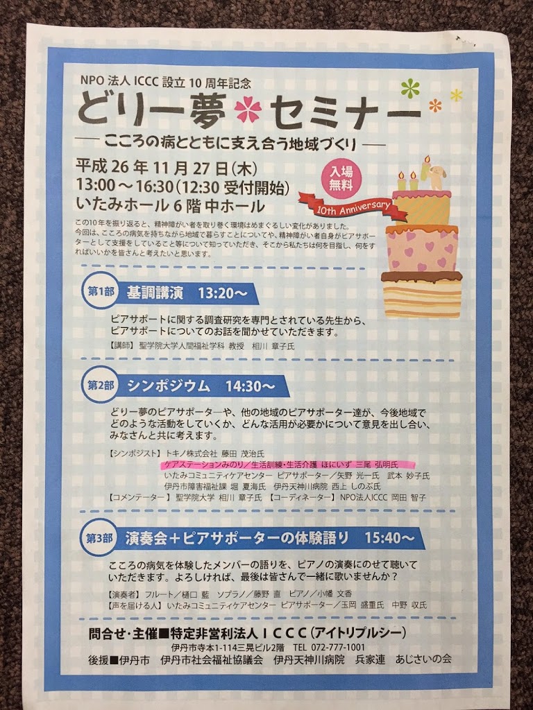 兵庫県伊丹市にあるNPO法人ICCCの法人化10周年記念「どりー夢セミナー」のシンポジウムにシンポジストとして所長補佐の藤田、ピアヘルパー、ピアスタッフが参加しました。
